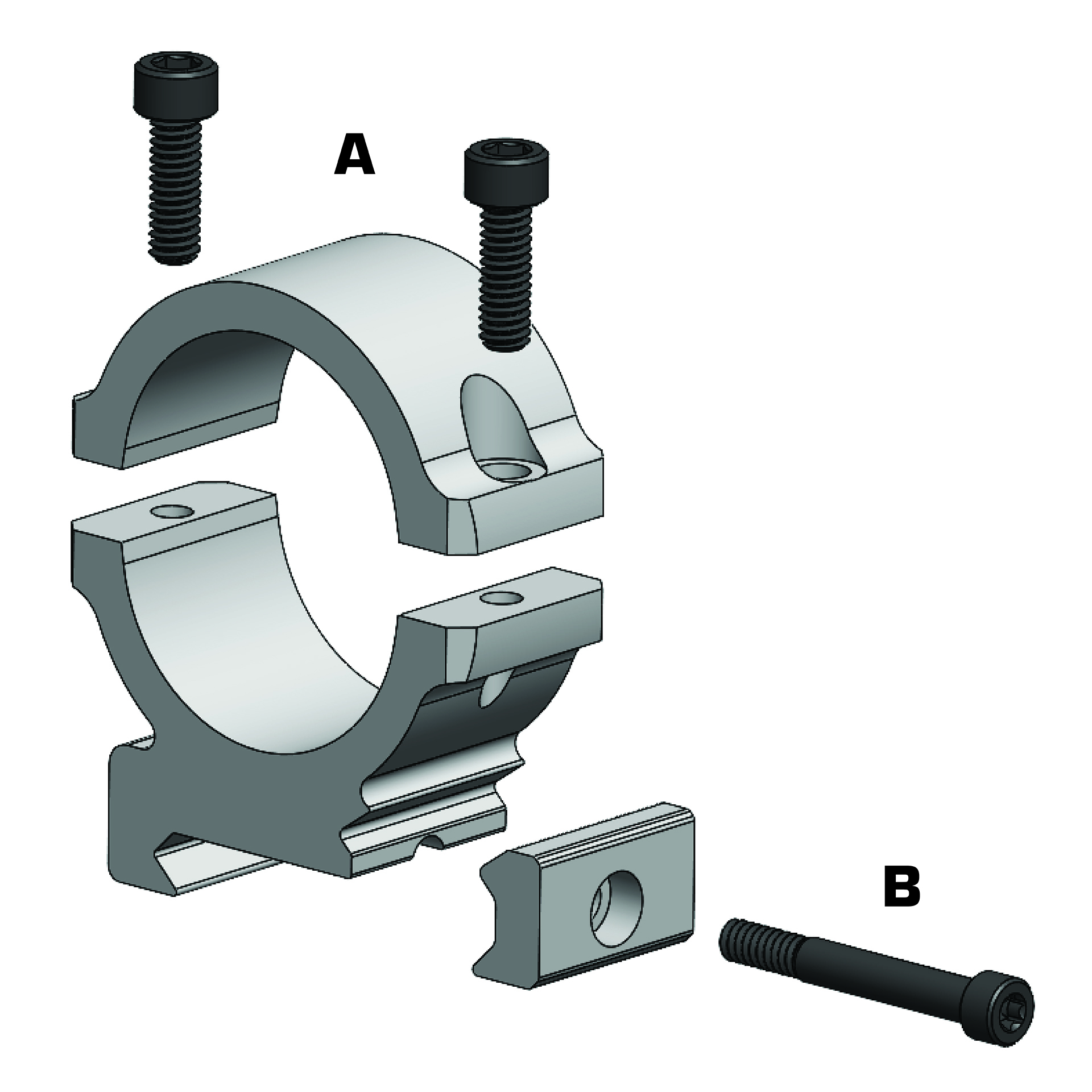 - Loosen clamp screw on each ring (B) and place in desired position on Maxima®/Weaver style bases or picatinny rail.